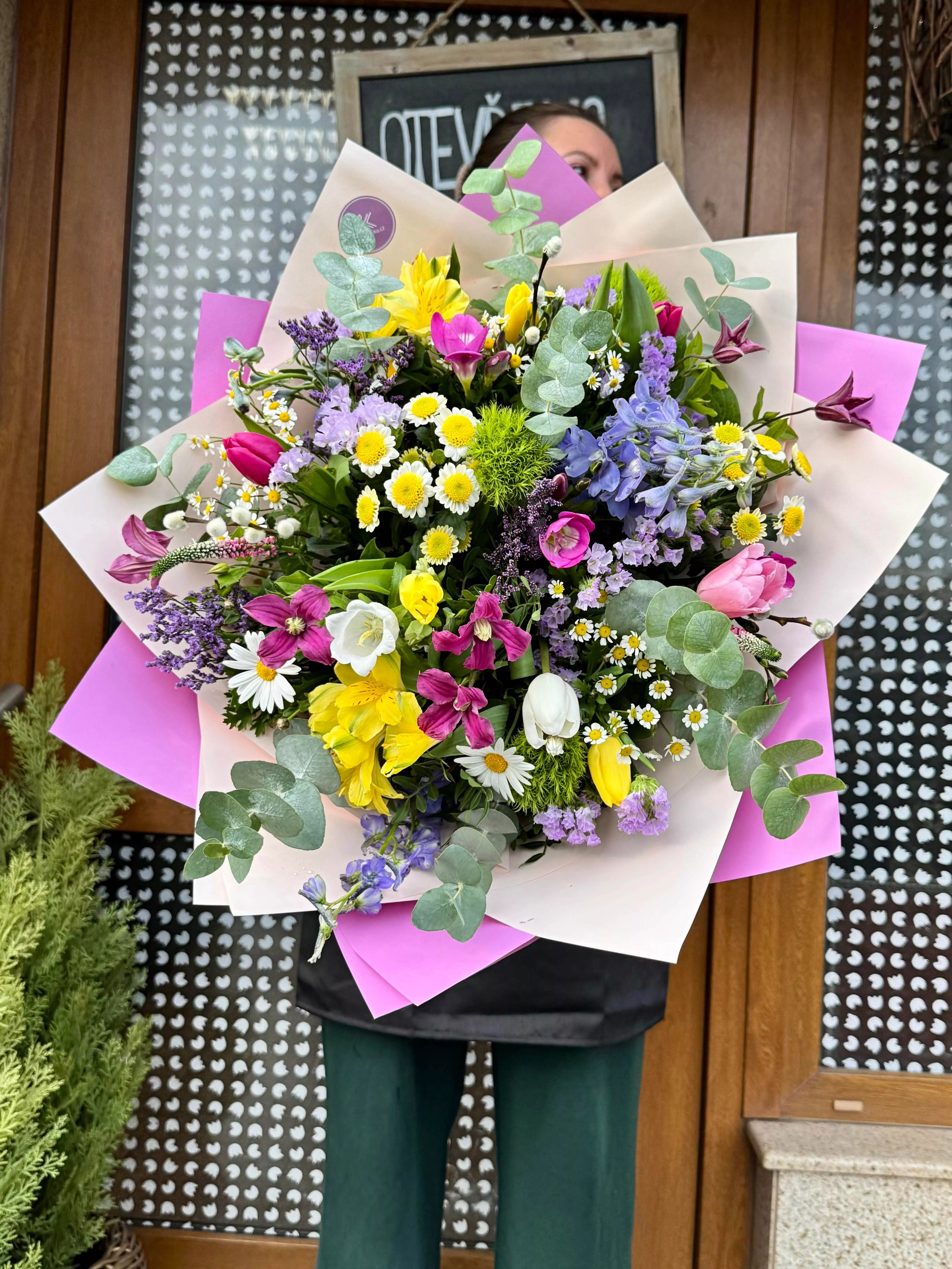 Sezónní kytice, do které vybíráme aktuální sezónní květiny. Aktuálně do ní nejčastěji dáváme tulipány, frézie, narcisy nebo gerbery.