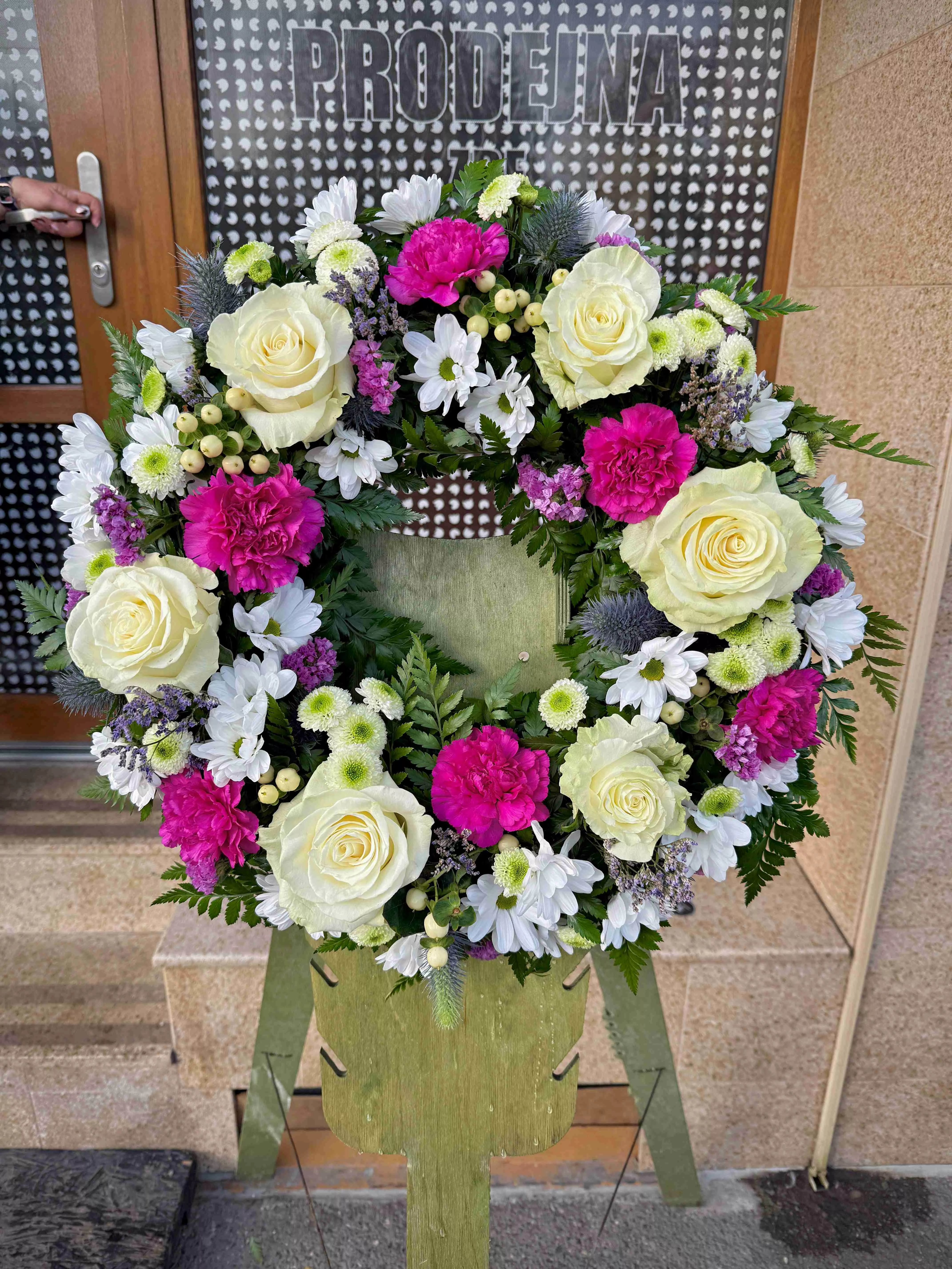 Důstojný a nádherný smuteční - pohřební věnec květin k poslednímu rozloučení. Pokud ho po obřadu přemístíte k místu piety, vydrží i 14 dnů čerstvý.