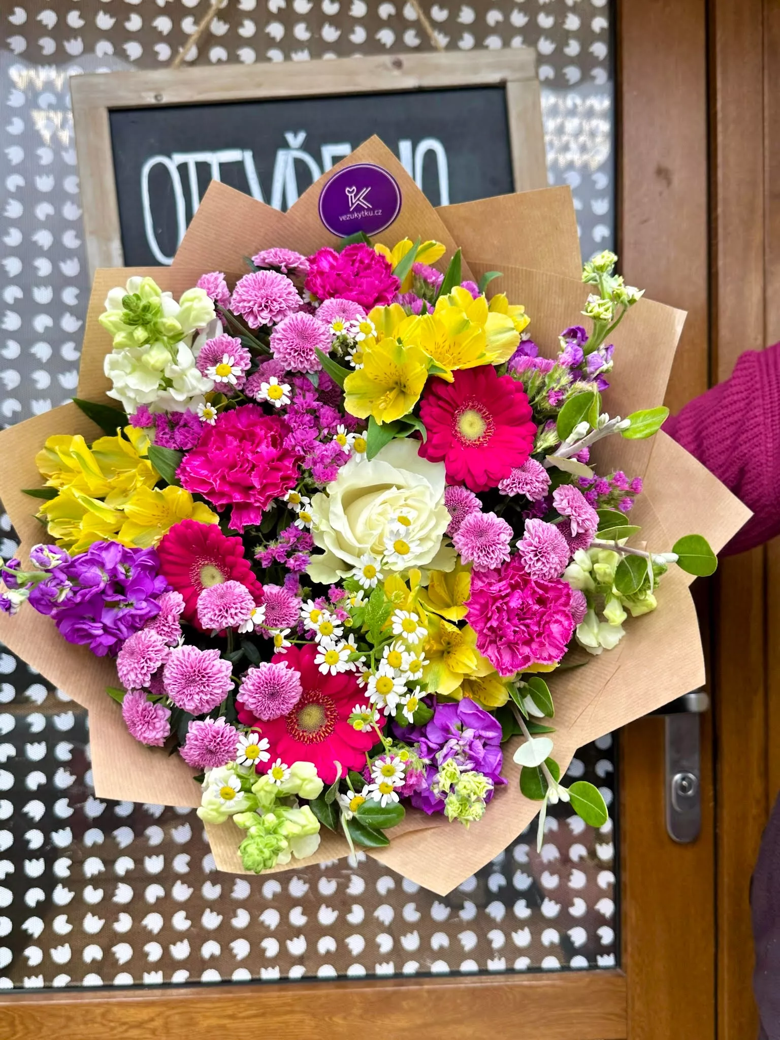 Naše nejoblíbenější barevná kytice spojuje originálnost, hravost a rozpustilost. Floristky ji tvoří s důrazem na bohatost, svěžest a neotřelé barevné kombinace. Každý kus je jedinečný – plný čerstvých květin a s minimem zeleně, aby vynikla jejich přirozená krása.