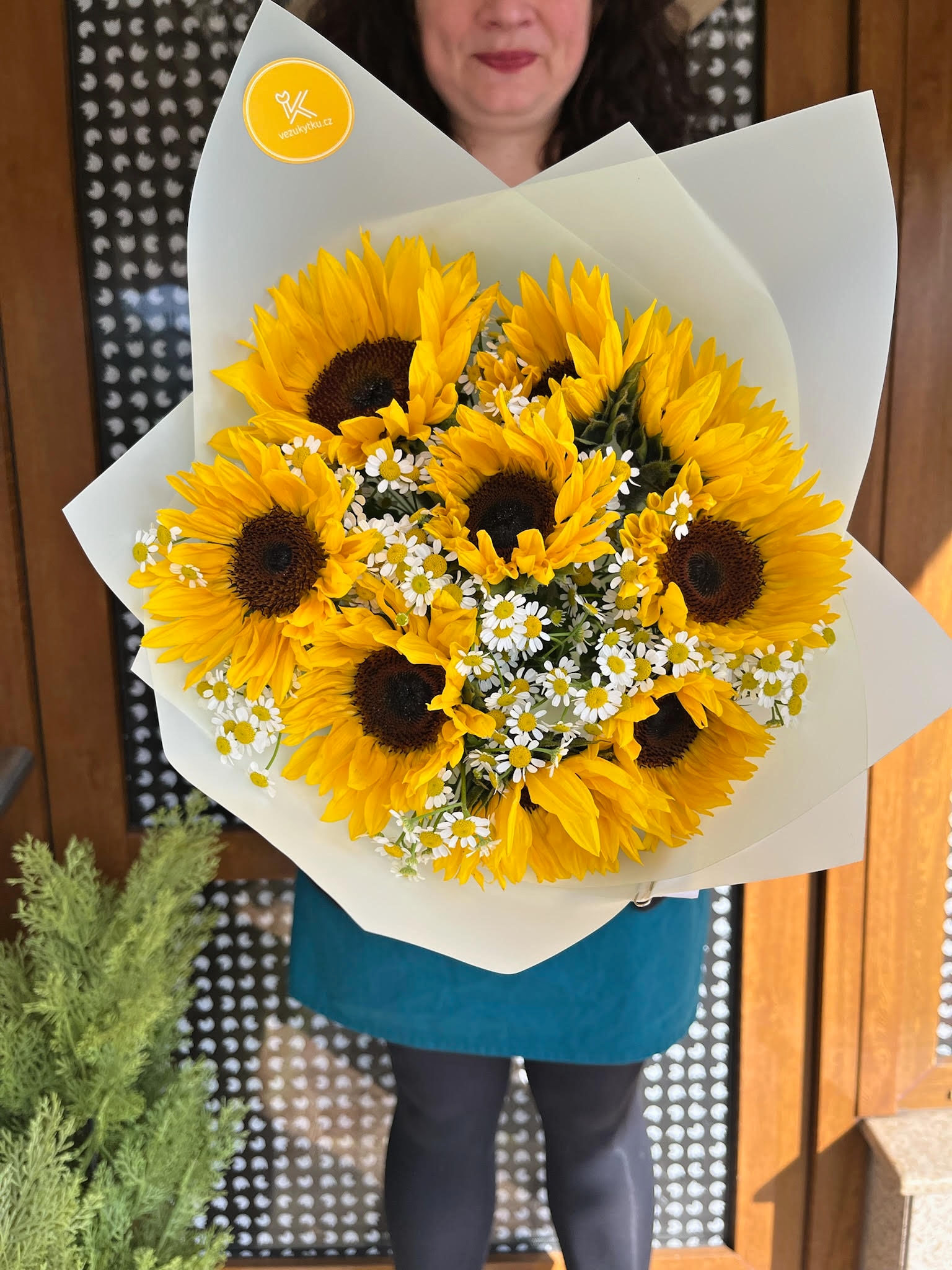 Slunečnice je sezonní květina, není v kvalitě dostupná po celý rok. Do našich kytic slunečnic používáme tyto velkokvěté slunečnice a dáváme minimum zeleně, aby více vynikla krása samotných květů.