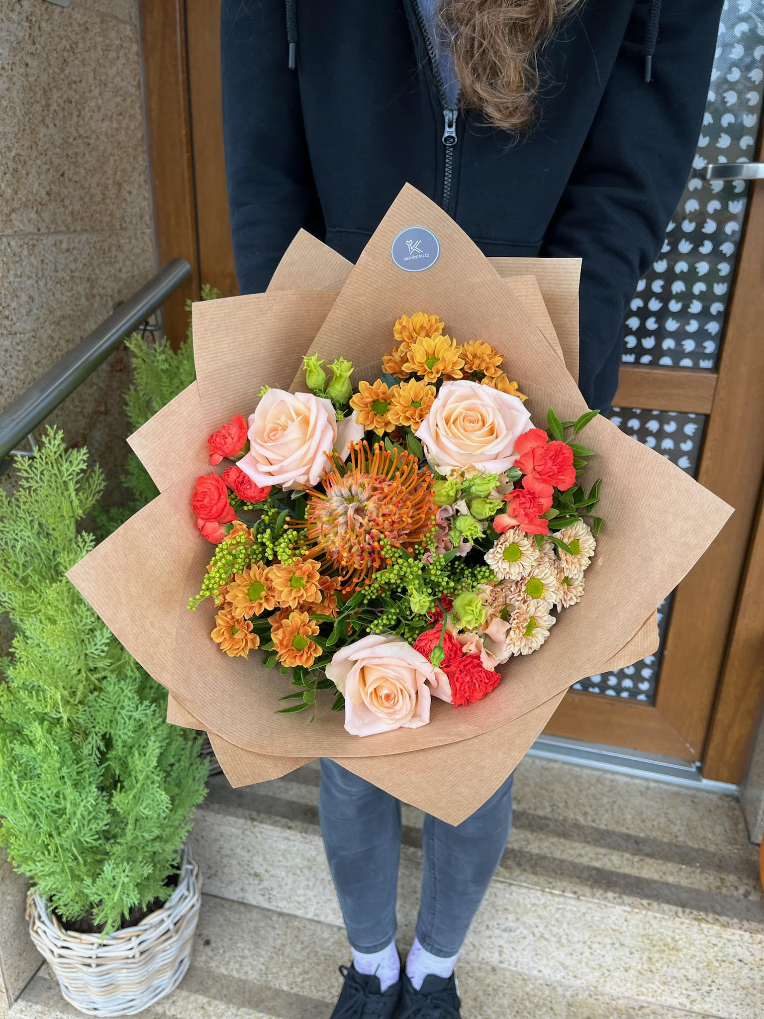 Tato kytice je pečlivě sestavena z čerstvých gerber, chryzantém, karafiátů, růží a sezónních oranžových květin, které společně vytvářejí harmonický a živý celek.