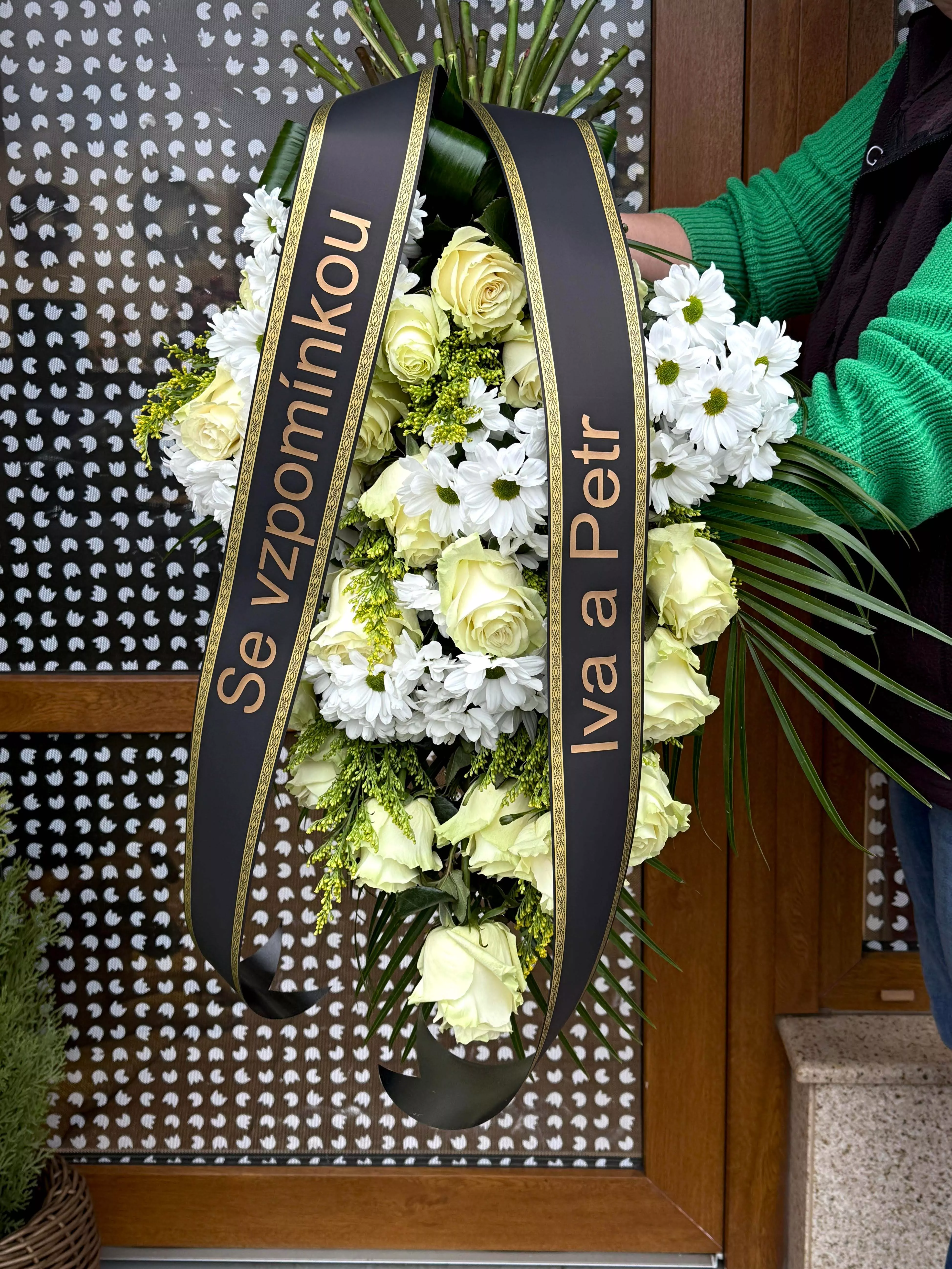 Vzkaz na smuteční stuhu uvedeme dle vašeho přání. Barva stuhy je volitelná, zvolit můžete černou, bílou, stříbrnou, zlatou a fialovou.