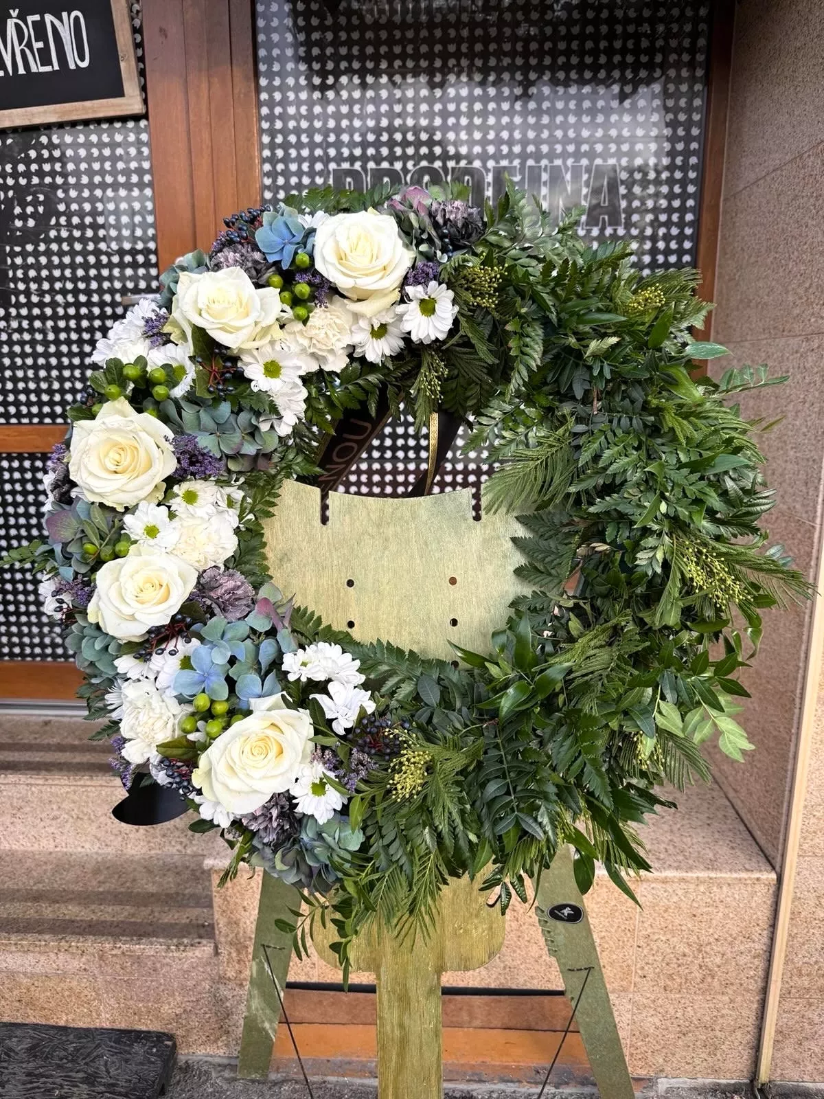 Luxusní vypichovaný smuteční věnec složený z prémiových růží nebo jiných květin.