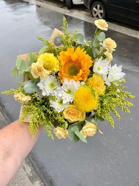 Žlutá kytice rozzáří úsměv nejedné ženě. Ve žluté kytici se nejčastěji vyskytují gerbery, karafiáty, chryzantémy, eustomy, craspedia a růže nebo exotické leucospermum.